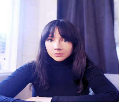 [Image Description: A white woman (Katie Farmer), with long shoulder dark length hair and bangs, and a dark turtleneck blouse, sits steady facing the camera.]