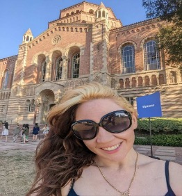 [Image Description: A white woman (Katie Farmer), with long shoulder length multicolor, dark shades, and a tank top, tilts her head slightly smiling at the camera.]