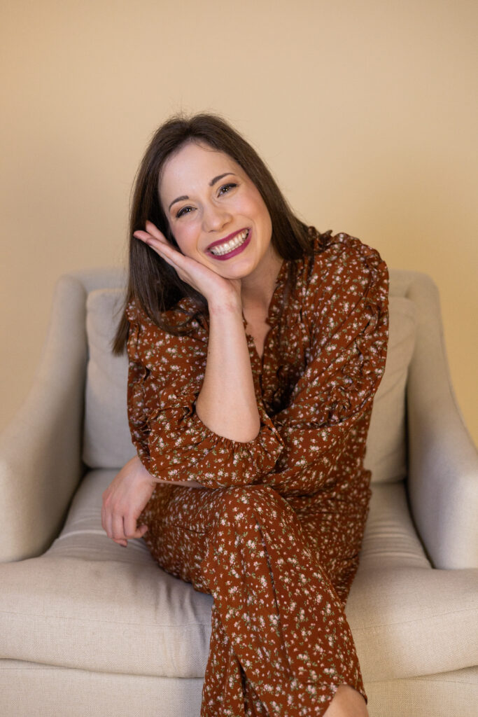 [Image Description: A Caucasian woman (Laura Andert) dressed in a floral jumper, sits in a chair with her legs crossed, arms folded on her lap, and one hand cups Laura’s smiling face.]