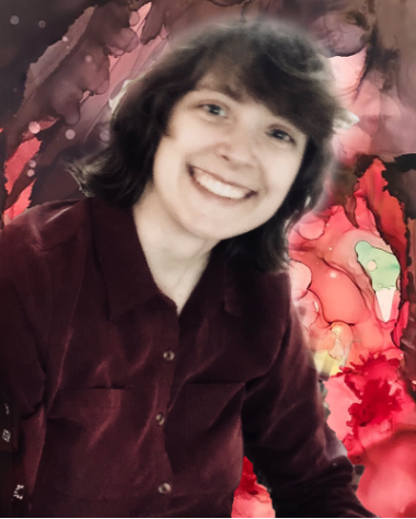 [IMAGE DESCRIPTION: Pictured is Liz Pritchard, a Caucasian non-binary individual with light brown hair and light-colored eyes. She is wearing a dark red button-up shirt – Liz is smiling at the camera, surrounded by her original artwork of various feathers resembling crows’ wings against a bright red background.]